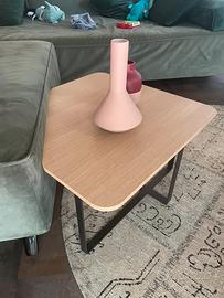 Tavolino di design gambe in metallo e piano effetto legno , di azienda produttrice Orme , qualità molto alta . Forma simpatica ed utile in quanto si può attaccare al divano dal lato smussato , per creare un effetto ambiente originale