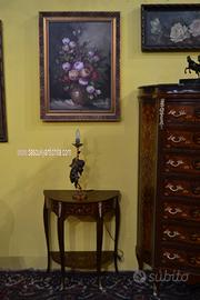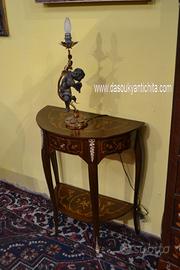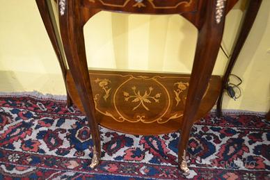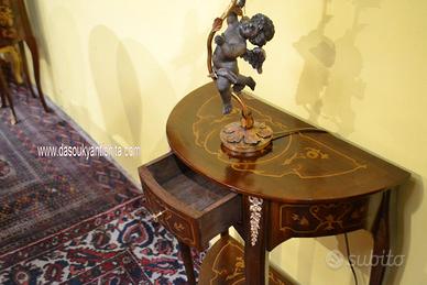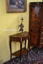 Tavolino – comodino a mezzo giro in stile Luigi xv ,noce e radica di noce intarsiato in legni di frutto bois de rose , acero a motivi floreali, con cassetto e pianetto, rifinito da applicazioni in bronzi cesellati e dorati.