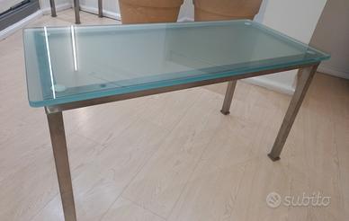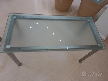 Tavolino in vetro e telaio cromato, misure del vetro 94x44 spessore 1,5 cm altezza totale 51 cm. Vetro non trasparente ma sfumato.