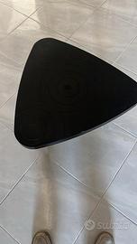 Il design è particolare: piano nero con motivo circolare inciso e gambe trasparenti rigate.