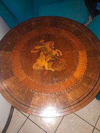 Tavolino realizzato con diverse essenze di legno massello. Mosaico che rappresenta San Giorgio ottima fattura in buone condizioni.