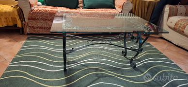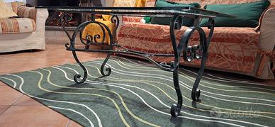 Raffinato tavolino da salotto realizzato su misura da fabbro artigiano, con solida struttura in ferro battuto e piano in cristallo spesso 10 mm, resistente e di grande impatto estetico.