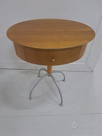 Tavolino ovalino in legno tinta ciliegio chiaro, con cassetto, basamento metallo tinta argento L. 60 prof. 50 h. 68