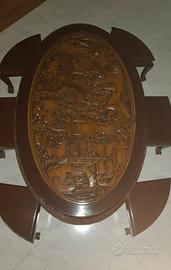 Bellissimo tavolino ovale da caffè/the cinese Vintage con piano in vetro, metà del XX secolo, realizzato in legno di mogano, minuziosamente intagliato mano, a rilievo raffiguranti di varie figure in piedi davanti edificio circondati da una scena paesaggistica, riproposti nella fascia sottopiano e nei sei sgabelli ( 2 quadrati e 4 a mezzo giro ), ad incastro.