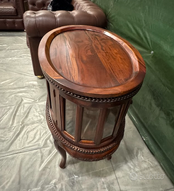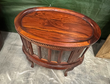 Vendo bellissimo tavolino vintage in legno, con vetrina apribile sia sul fronte che sul retro. Il piano superiore è removibile e può essere utilizzato come vassoio. Forma ovale, in ottime condizioni.