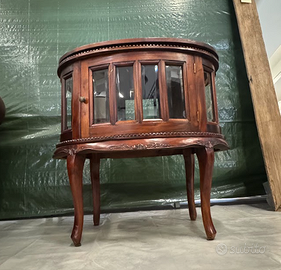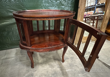 Vendo bellissimo tavolino vintage in legno, con vetrina apribile sia sul fronte che sul retro. Il piano superiore è removibile e può essere utilizzato come vassoio. Forma ovale, in ottime condizioni.