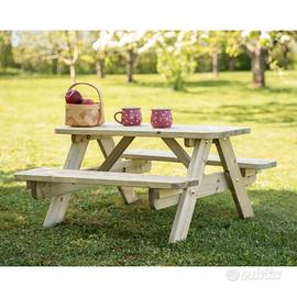Causa inutilizzo vendo nuovo tavolino per bambini in legno di pino autoclavato per interno o esterno. Misure comprese di panchine 90 x 90. Costo a nuovo 199 vendo a 70 € praticamente regalato.
