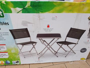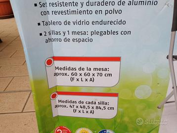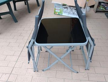 Tavolino pieghevole sia x casa che per giardino piano in vetro temperato con sedie in tessuto anche quelle pieghevoli. Misura 60 x 60 h70. Non faccio spedizioni chi lo vuole può venire a vederlo senza problemi. Il tavolino è praticamente nuovo ancora con il suo imballaggio
