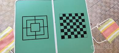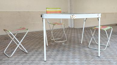Tavolino pieghevole da campeggio anni 80 vintage, robusto e facile da utilizzare, da chiuso diventa una leggera valigetta che contiene 3 sedioline (una si è rotta), usato poche volte, presenta un'ammaccatura sul piano dove è disegnata la scacchiera (non inficia l'utilizzo del tavolino) e piccoli segni di impiego nella cornice.