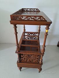 Tavolino in vero legno di radica con intarsi e intagli, completo di cassetto L. 69 p. 40 h. 96, escluso trasporto, piccole parti da restaurare