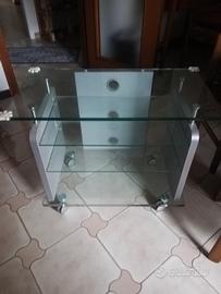 Tavolino come nuovo in vetro porta TV con due ripiani e ruote per spostarlo.