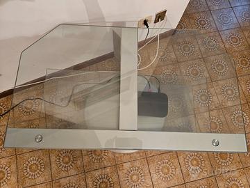 Tavolino porta TV Ikea Svind con base girevole, ripiani in vetro, telaio e base in alluminio grigio, spazio posteriore per nascondere i cavi.