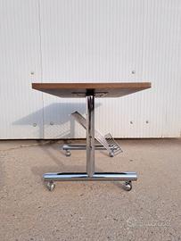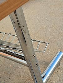 Tavolino basso con ripiano porta riviste e rotelle. Piano rettangolare in legno e struttura in metallo cromato, design anni 70. Ripiano portariviste in griglia metallica con inclinazione regolabile a piacere. Buone condizioni con alcuni segni del tempo sulle zampe metalliche. piano 80 x 50 cm alto 52,5 cm disponibile a Olmo di Martellago