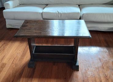 tavolino basso da salotto con funzione portariviste integrata, realizzato interamente in legno massiccio con finitura scura naturale. Dimensioni: : 76x 43 Altezza: 53 cm L’oggetto si distingue per la sua solidità e per i raffinati dettagli decorativi: i fianchi sono arricchiti da formelle intagliate a rilievo, tipiche dello stile rustico classico o rinascimentale. La parte inferiore ospita un pratico vano per riporre riviste, libri o telecomandi, rendendolo un pezzo d'arredo non solo estetico ma anche funzionale. Ideale per salotti classici, taverne eleganti o per chi ama il contrasto "antico-moderno" in ambienti contemporanei. Condizioni: L'oggetto è in buone condizioni vintage. Presenta i naturali segni del tempo sulla superficie che ne testimoniano l'autenticità e aumentano il fascino del pezzo (vedi foto). Struttura molto solida e stabile. •🚚 Ritiro a mano - Zona: Padova / Sacra Famiglia (NO ZTL, accesso libero per le auto e posto per parcheggiare in giardino) •💡 Sono presenti anche molti altri mobili in vendita, visionabili durante la visita o sulle altre inserzioni
