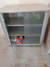 Tavolino porta TV grigio con ante in vetro satinato, push and pull, come nuovo.
