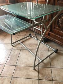 Tavolino in vetro satinato con struttura in robusto tubolare in metallo verniciato da utilizzare come postazione di studio o lavoro per PC; dotato di ruote posteriori per un facile spostamento, cassetto estraibile per tastiera o documenti di lavoro, piattaforma in vetro rialzata dal piano per posizionamento del monitor e ampia superficie utile di appoggio. Le dimensioni del piano principale sono di circa 80x50cm con altezza di 75cm circa da terra, la piattaforma monitor misura circa 30x40cm ed è 10cm più alta del piano; ingombro 80x70cm h 90cm circa. La piattaforma estraibile per la tastiera si muove su guide a sfere ed è perfettamente funzionale. Usato ma tenuto molto bene, privo di difetti, come nuovo e all'occorrenza completamente smontabile. Ritiro a carico dell'acquirente. Mestrino - Padova.