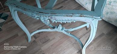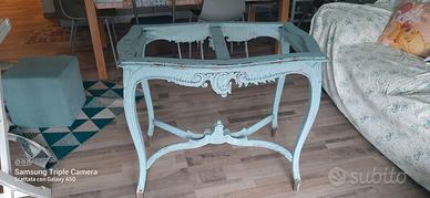 Vendesi incantevole tavolino d’appoggio in stile Luigi XV / Provenzale, caratterizzato da linee sinuose e raffinati intagli artigianali. Il mobile presenta una finitura azzurro polvere decapato, che lascia intravedere il legno sottostante per un autentico effetto "vissuto" e romantico.