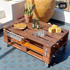 Come da titolo vendesi tavolino da giardino, terrazzo o balcone, realizzato a mano su due pedane. Struttura solida e durevole, completo di ruote.