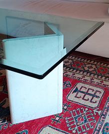 Tavolino rettangolare con piano in vetro smussato e gambe in marmo travertino bianco, stile Mid - Century Misure 110x70 h. 47 cm