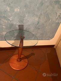 Tavolino rotondo con piano in vetro trasparente e base centrale in legno massello.