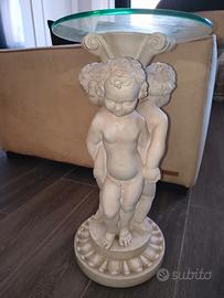 Tavolino rotondo in oxolite polvere di marmo con puttini angioletti e ripiano rotondo in cristallo. Misure dell'oggetto: h.57 cm. / diametro 31 cm. solo ritiro zona Jonio. prezzo: 60 euro