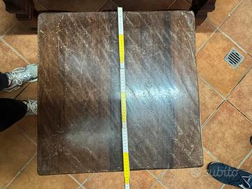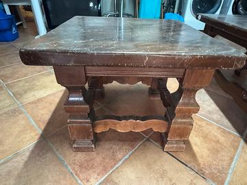 Vendesi tavolino basso quadrato in stile rustico/arte povera, realizzato in legno massiccio molto robusto. Il mobile segue la stessa linea classica del modello rettangolare, con gambe massicce lavorate e traverse sagomate che garantiscono un'ottima stabilità. Ideale come tavolino da salotto, punto d'appoggio in una taverna o come complemento d'arredo per ingressi dal sapore vintage. Il piano presenta i segni del tempo e dell'uso (graffi superficiali visibili in foto) che gli donano un carattere vissuto, ma può essere facilmente riportato a nuovo con una passata di carta vetrata e cera.