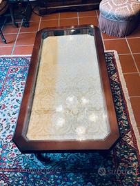Tavolino da salotto con inserito portaoggetti in stoffa,per collezioni tipo orologi,monete,oggettistica varia. Mantenuto in ottime condizioni, privo di tarli, legno massello in faggio.Misure 122 x 64 altezza 40 cm. Non è possibile la spedizione. Causa cristallo fragile.