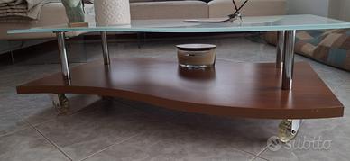 Tavolino salotto di design. piano sotto legno ciliagio. piano sopra cristallo. 4 rotelle. in perfette condizioni . Lunghezza 103. Larghezza max 55. Altezza da terra 33. ritiro a cura acquirente.