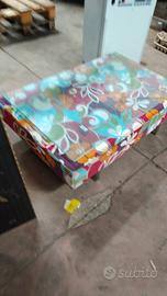 Vendo originale tavolino da caffè basso, caratterizzato da un vivace rivestimento in tessuto con pattern floreale multicolore e un elegante piano protettivo in vetro temperato.