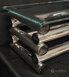 Tavolino da salotto dal design Space Age, caratterizzato da una struttura scultorea in tubolare di acciaio cromato lucido con elementi cilindrici sovrapposti e da uno spesso piano in cristallo.