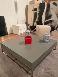Tavolino Binova interni 1958,modello Jesse Chelsea misura 90x90, struttura in metallo cromato e base in laccato opaco,tenuto in esposizione,vendo anche tappeto mis.3x2,lampada Penta,pouff e quadri stile minimalista mis 130x100,tutto da esposizione