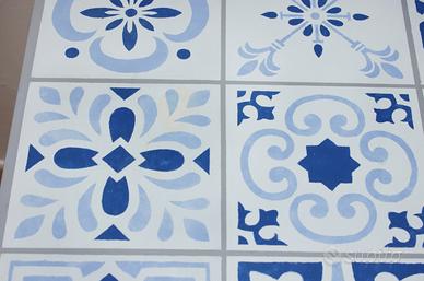 Interamente dipinto a mano, costituito da un piano esclusivo ed irripetibile che riproduce con stencil antiche maioliche - cementine artigianali tipiche di antiche abitazioni pugliesi, con bellissimi decori particolareggiati sulle tonalità del blu fiordaliso e blu cobalto. Piccole imperfezioni costituiscono specifica caratteristica dell'oggetto e testimoniano la speciale manifattura artigianale. Il piano, che poggia su robuste gambe in legno, presenta su un lato un piccolo e poco visibile alone (come da foto allegata) che non ne inficia la bellezza nè l'utilizzo.