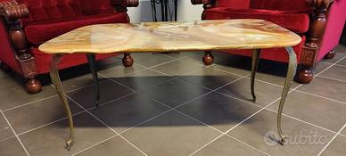 Tavolino da salotto in onice Età stimata Metà del XX secolo (circa 1950-1970) Materiale Onice, Ottone. Significato storico L'onice era un materiale molto apprezzato per i tavoli da salotto e gli oggetti decorativi nel periodo mid-century. Curiosità [L'onice è una pietra naturale che si forma in grotte e vulcani. Il peso dell'onice lo rende molto stabile come piano del tavolo. A seconda della fonte di luce, l'onice può apparire traslucido.La forma del tavolo, con le gambe in ottone, è tipica dello stile mid-century moderno, popolare negli anni '50 e '60. Origine Italia o altri paesi con cave di onice (ad esempio, Messico, Pakistan) Consigli per il restauro Per la pulizia dell'onice, usa un panno morbido e umido con acqua tiepida. Le gambe in Ottone possono essere pulite e protette con prodotto specifico.