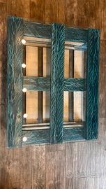Tavolino realizzato a mano con epal e vetro su ruote. Colore ottanio. Misure L 100 L 80 H40