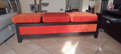 tavolino soggiorno con cuscini poggia piedi. tavolino Ikea colore Venghè lungo 148 cm e alto 35 con vano porta oggetti. I cuscini sono stati realizzati da un tappezziere i gommapiuma ad alta densità con rivestimento intercambiabile in velluto. Il tavolo è in ottime condizioni, le fodere dei cuscini portano qualche segno di usura.