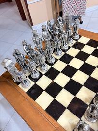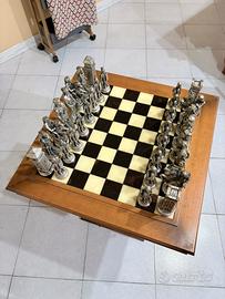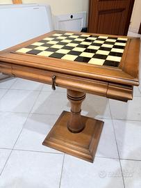 Tavolino il legno con scacchiera completa di scacchi in gesso laccato in colore argento, Tavolino con cassetto, Condizioni ottime,