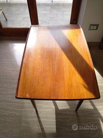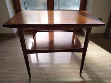 Tavolino scandinavo anni ’60 rettangolare, design MM Moreddi Danmark. Composto da un ripiano superiore con bordi rialzati su i lati, un ripiano inferiore e gambe affusolate. Realizzato completamente in teak massiccio con particolari in ottone. Zona Montesacro