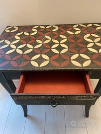 Tavolino o scrittoio rivisitato in stile moderno ma rustico materico . Piano con stencil e in cassetto . Misure 79x49xH74