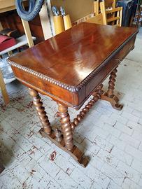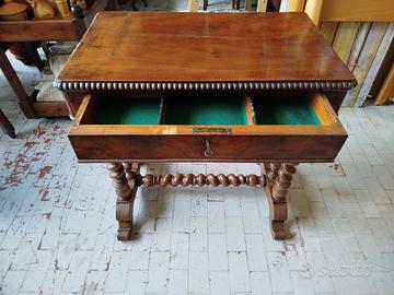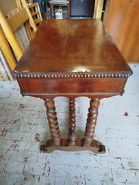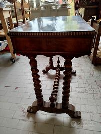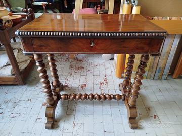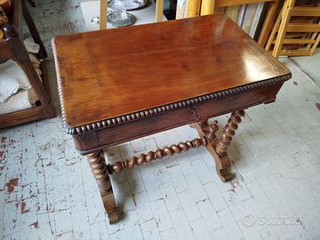 Tavolino in legno di noce Luigi XIII con gambe a torciglione un cassetto.