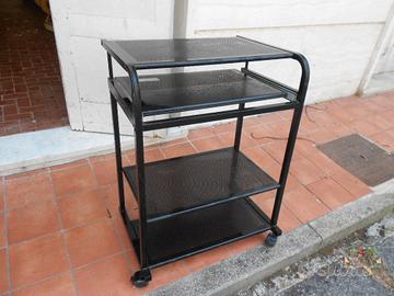tavolino/scrivania per pc metallo nero con ripiani di cui uno estraibile per tastiera e l'altro sotto per stampante, con 2 ruote. misure cm. 44x78x58 Usato poco e perfetto. Posso spedire ma preferisco il ritiro su Genova.