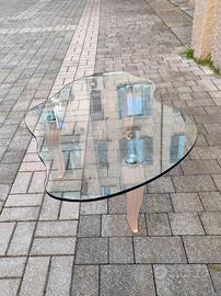 Top in vetro temperato trasparente spesso 10mm, gambe in vetro colato rosa tenue acidato (finitura satinata e poco riflettente), elementi di fissaggio in acciaio inox.