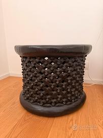 Tavolino / Sgabello africano intagliato – scultura tribale in legno massello (anni ‘70) Straordinario tavolino africano intagliato a mano da un unico blocco di legno, caratterizzato da una complessa lavorazione a reticolo geometrico e da una forma cilindrica scultorea. Questo tipo di oggetto, originario dell’Africa centrale (area Congo / Camerun), nasce tradizionalmente come sgabello cerimoniale e simbolo di status, oggi molto ricercato nel design contemporaneo per la sua forte presenza estetica. Il pezzo si distingue per: – lavorazione artigianale fitta e tridimensionale – patina scura naturale del legno – proporzioni solide e armoniose – grande versatilità (tavolino, side table, seduta) Perfetto in ambienti: – wabi-sabi – etnico contemporaneo – interiors pubblicati su riviste come Elle Decor e AD Condizioni: ottime, con normali segni del tempo coerenti con l’età. Un oggetto decorativo di forte impatto, ideale anche per ambiente minimal