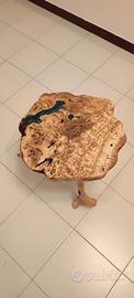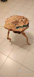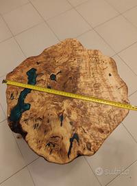 Tavolino sgabello realizzato con legno di ulivo stagionato e resina epossidica, rifinito con olio di cera dura che ne risalta le magnifiche venature naturali. Diametro di circa 47cm e alto 45.
