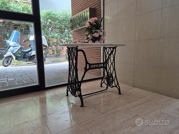 Tavolino d'arredo realizzato dal recupero di una storica base per macchina da cucire Singer in ghisa originale. Il pezzo unisce lo stile industrial d'epoca all'eleganza classica del marmo, rendendolo perfetto come consolle da ingresso, scrivania leggera o elemento decorativo per il soggiorno.