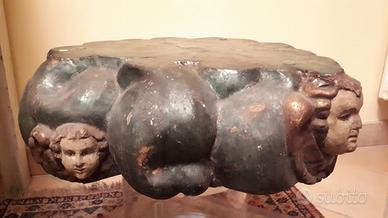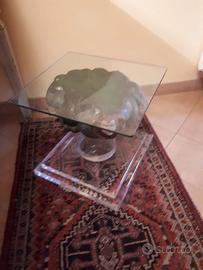 tavolino smontabile in quattro pezzi(girevole) base in plexiglass 51cm x47cm cilindro in plexiglass diametro 20cm piano tavolino in vetro 51cm x47cm parte in legno con angioletti intagliati altezza tavolino 45cm