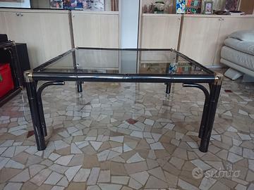 Tavolino soggiorno in vetro anni '70 in stile hollywood regency. Struttura in metallo laccato nero e piano vetro fumè. Dimensioni: 88cm x 41cm x 88cm Solo ritiro a mano a Milano