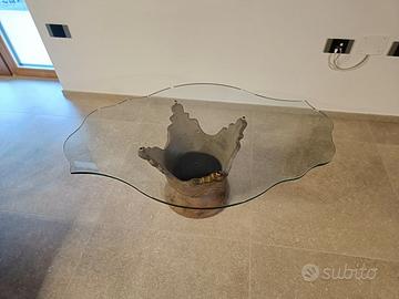 Tavolino soggiorno in ottimo stato, in vetro e coccio. Vetro spesso un centimetro, punto più largo largo 79 cm, punto più lungo 110cm, altezza da terra 45 cm. Nella base in coccio vanno inseriti fiori secchi ,finti o veri tipo piante grasse.