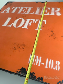 Il piano superiore presenta scritta stencil âATELIER LOFTâ, con effetto volutamente usurato che richiama lâestetica delle vecchie fabbriche.