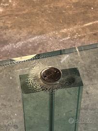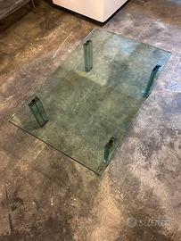 Tavolino in cristallo con tiranti in acciaio, progettato da Renzo Piano e prodotto Fontana Arte nel 1985.