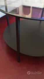 Tavolino tondo con base in vetro,struttura in metallo nero,base inferiore in legno nero, piedini regolabili. In perfette condizioni tranne un piccolo segno sulla base inferiore( come segnalato nell' ultima foto) ma facile da riprendere con un po' di colore (semplice pennarello indelebile).